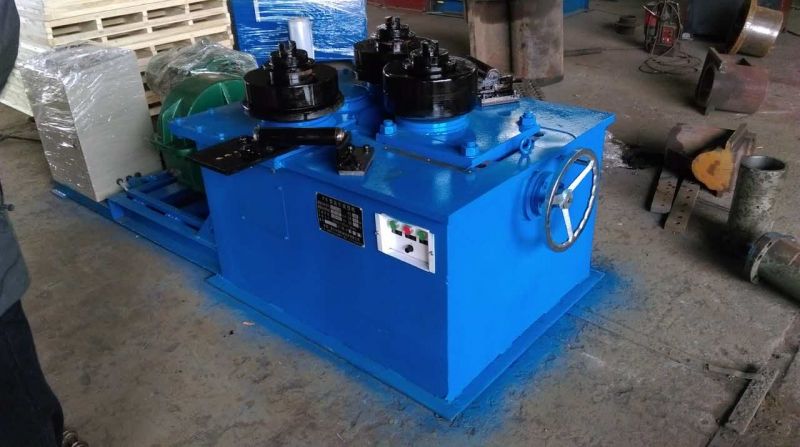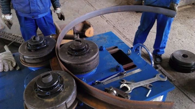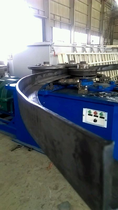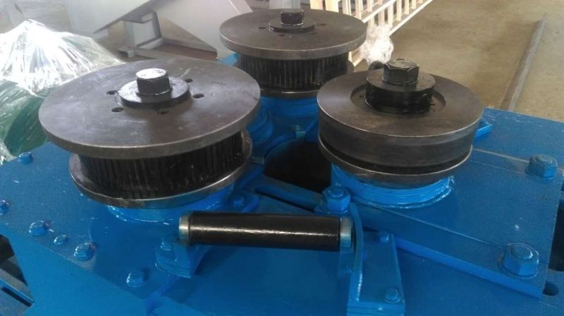 F6型卷圓機(jī)是對稱式三輥型材卷圓機(jī),集機(jī)電一體,將電動機(jī)輸出的較高轉(zhuǎn)速通過傳動裝置、聯(lián)軸器、減速機(jī)、齒輪等轉(zhuǎn)換為所需的大轉(zhuǎn)矩低轉(zhuǎn)速,帶動位置固定的兩主動輥實(shí)現(xiàn)旋轉(zhuǎn)運(yùn)動,為型材行走提供扭矩。被動輥通過手輪前進(jìn)、后退實(shí)現(xiàn)位移,為卷制型材提供所需的加壓力,位移量由數(shù)字標(biāo)尺實(shí)時(shí)顯示。三個(gè)工作輥成等腰三角形分布,通過移動被動輥位置實(shí)現(xiàn)這三個(gè)點(diǎn)形成的弧線達(dá)到所需彎曲半徑,即調(diào)整所彎型材的曲率。借助被動輥的壓緊及兩主動輥的旋轉(zhuǎn)運(yùn)動,使型材經(jīng)過多道次連續(xù)彎曲,產(chǎn)生永久性的塑性變形,用于常溫狀態(tài)下將型材卷制成圓形、弧形、螺旋形等工件。